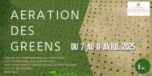 Aération des greens 13 avril 2026 – 14 avril 2026 Aération des greens les 13 et 14 avril 2026 (en fonction de la météo). iCal Google Voir le calendrier complet